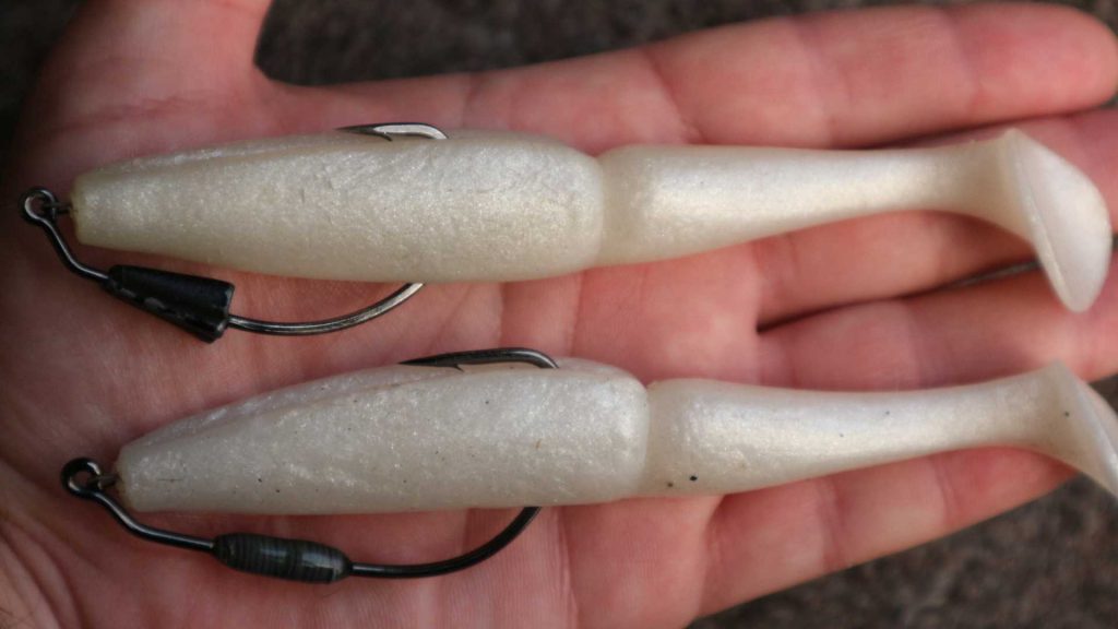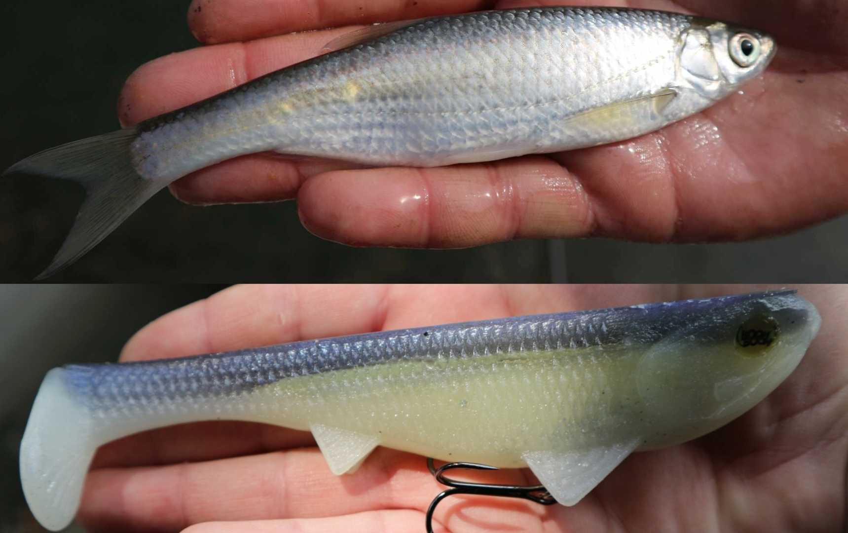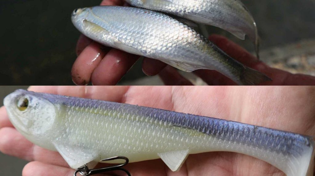 În cazul în care vă întrebați ce pește este cel din imagine și ce culoare are swimbaitul care îl imită atât de bine cromatic, povestea e următoarea: mai întâi am căutat să văd ce specii de pești-pradă se află în lacul respectiv, apoi am încercat să le găsesc echivalentul. Iar pentru săbioara din imagine, cea mai apropiată combinație de culori mi s-a părut Sexy Shad. Acest pattern a fost inventat de celebrul bass pro american Kevin VanDam și produs, inițial, de compania Strike King, care îl sponsorizează pe multiplul campion Bassmaster Elite KVD. Se pare că această culoare vrea să imite speciile de shad nord-americane, însă iată că este un ”perfect match” pentru săbioara de la noi și din Europa.