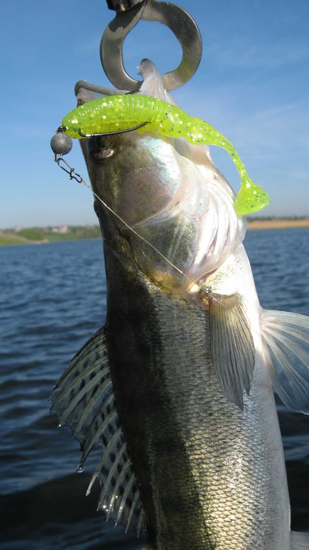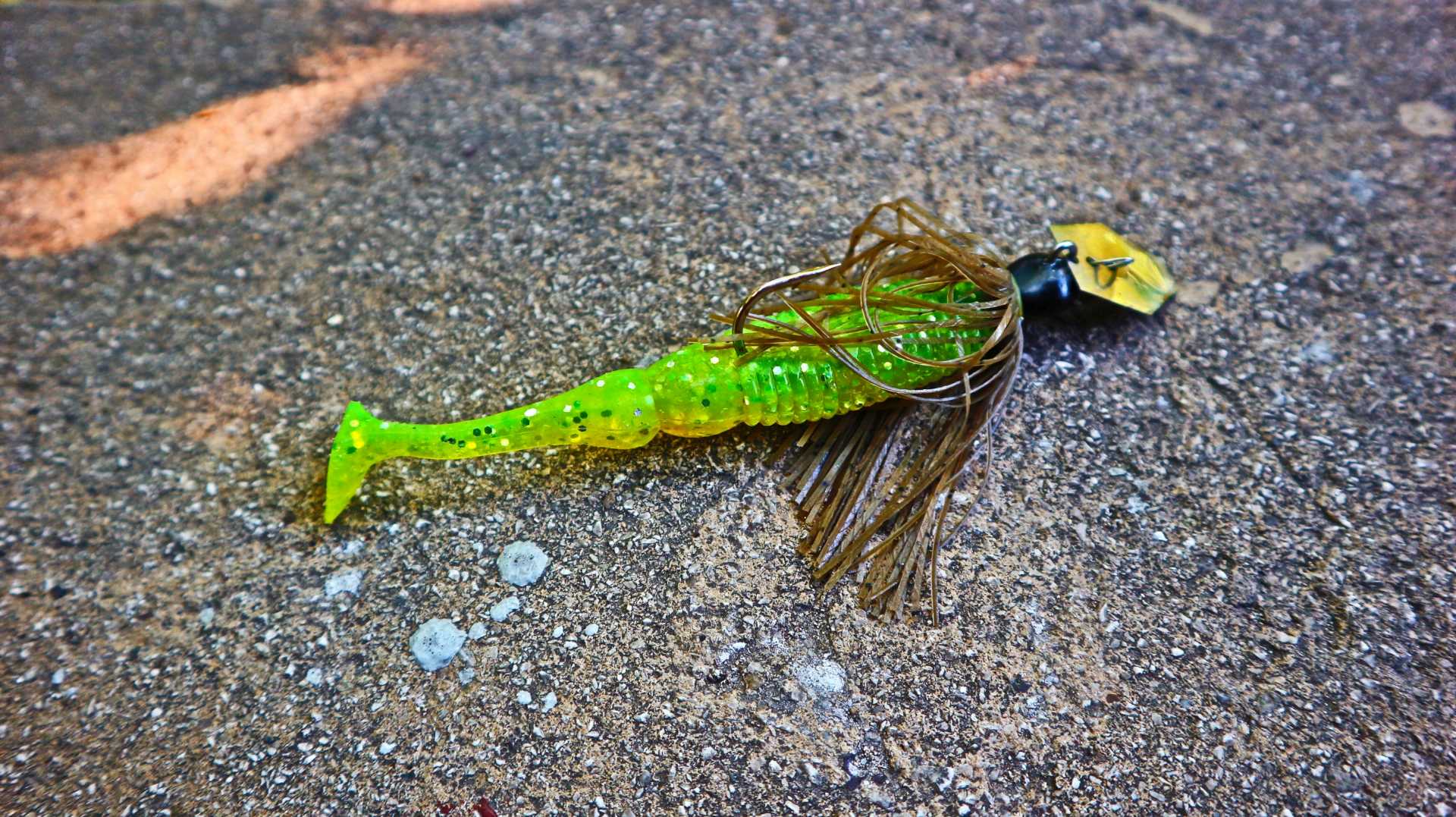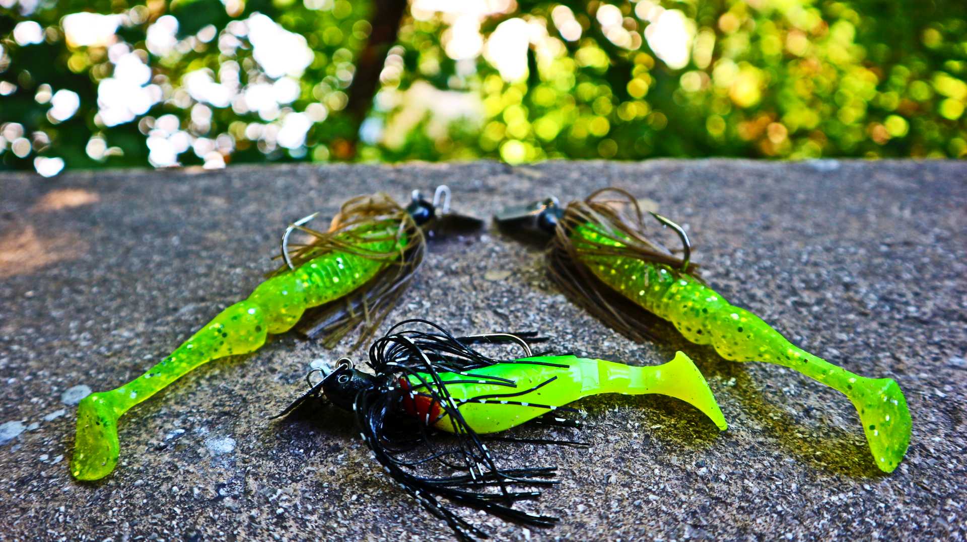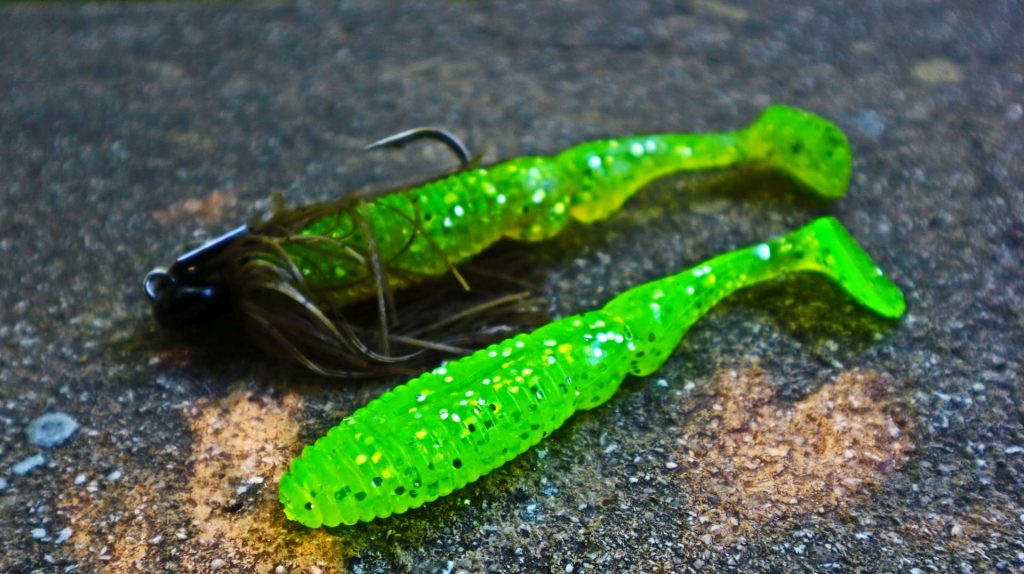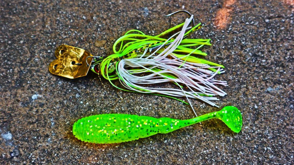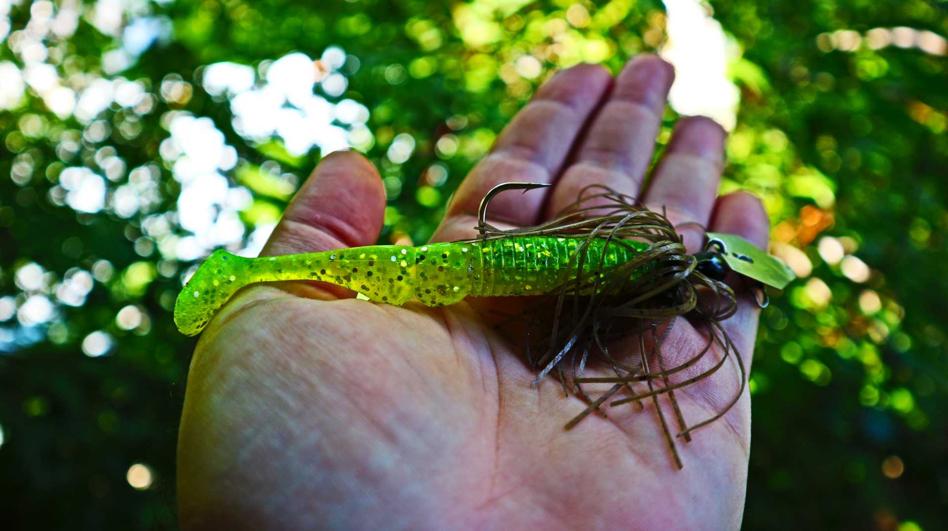 Pentru situațiile de vară, cu apă tulbure, prefer un shad chartreuse cu glitter, cu o coadă în formă de paletă care adaugă și mai multe vibrații evoluției chatterbaitului: